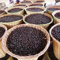 Acai berries are the fruit of the Euterpe oleracea palm tree. Acai berries are small, round, black-purple fruits, similar in appearance to a grape, but smaller and with less pulp. The ripe fruits are a deep purple color, or green, depending on the kind of açaí and its maturity. They contain a single large seed. The seed makes up about 60-80% of the fruit.